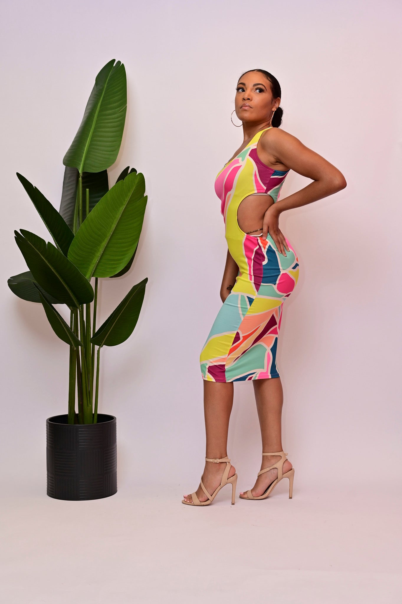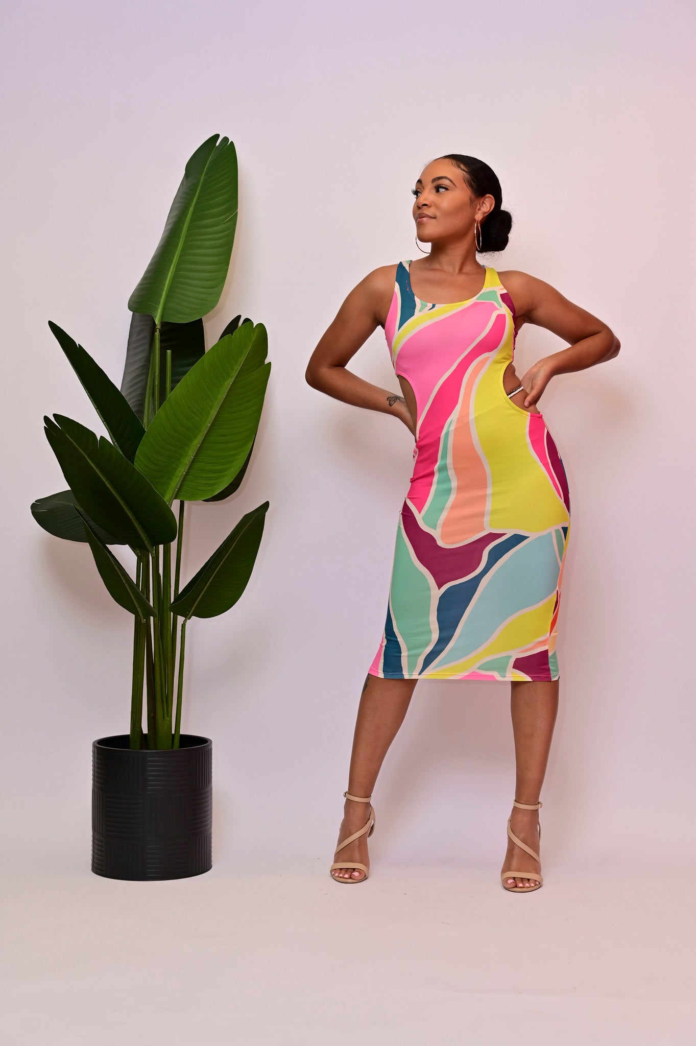 This colorful bodycon dress features stylish cutouts on the sides, adding a touch of edginess to your look.